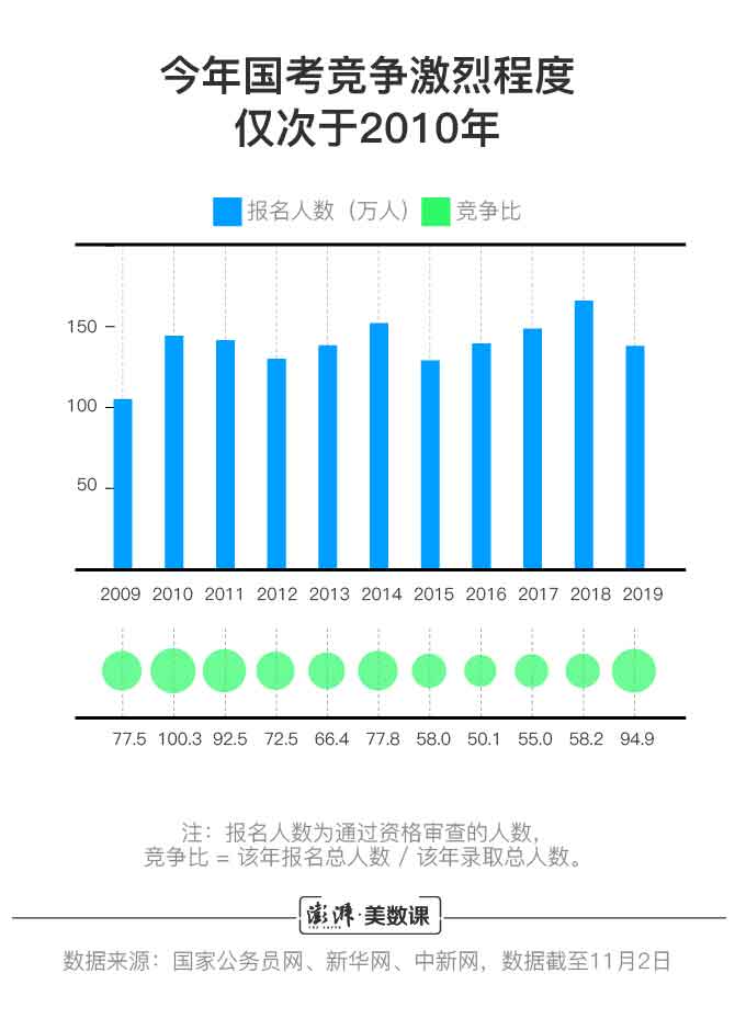 根據國(guó)家(jiā)公務員(yuán)局官網所提供數(shù)據,今年(nián)國(guó)考,過審報(bào)名人(rén)數(sh↔ù)與計(jì)劃錄用(yòng)人(rén)數(shù)之比約為(wèi)95:1。這(zhè)就(jiù)意味著(zhe),從(cóng)平均水(shuǐ)平來(lái)講,每個(gè∑)崗位都(dōu)幾乎是(shì)“百裡(lǐ)挑一(yī)”;這(zhè)樣的(de)競争激烈程度≈,幾乎比去(qù)年(nián)高(gāo)出一(yī)倍(58:1),在近(jìn)十年(nián)中僅次于2010年(nián)(100:1)。