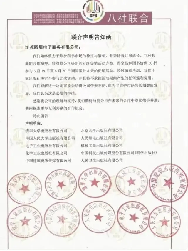 根據聯合聲明(míng)告知(zhī)函,此次618促銷方案要(yào)求全品種圖書(shū)價保2-3折參與5月(yuè)19日(rì)至6月(yuè)20日₩(rì)期間(jiān)累計(jì)8天的(de)促銷活動。